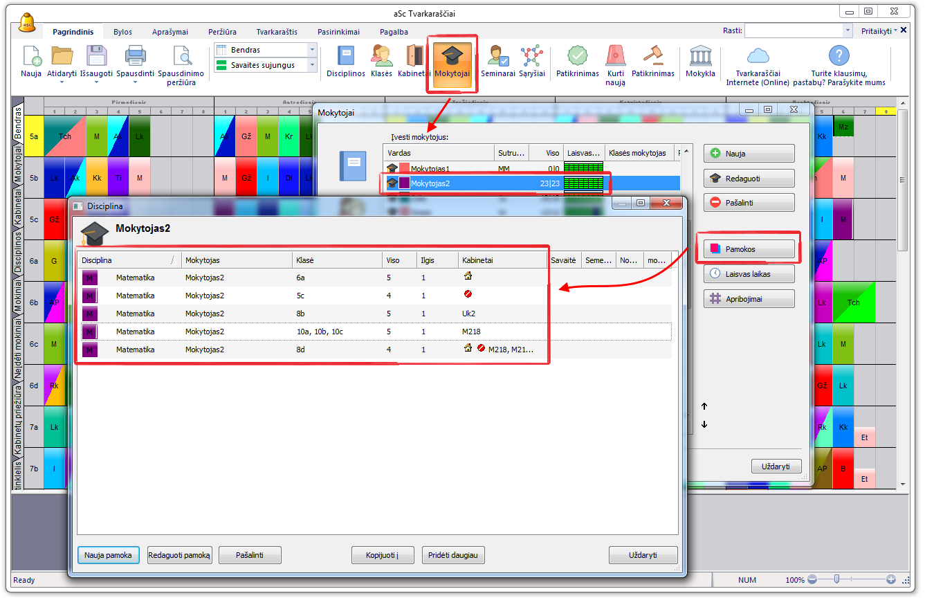 Pastaba: Jei mokytojui yra įvestas kabinetas, kuriant pamoką šiam mokytojui, jis bus pažymėtas paukščiuku ir šalia įrašytas kabineto numeris.