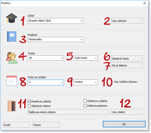 10. Viac týždňov/termov: Ak vaša škola funguje na viac než týždennom cykle (dva-tri týždne, alebo termy=semestre), môžete priradiť hodinu na rovnaké vyučovacie hodiny pre všetky týždne, alebo iba do jedného týždňa (konkrétneho alebo ľubovoľného) na rôznych vyučovacie hodiny.