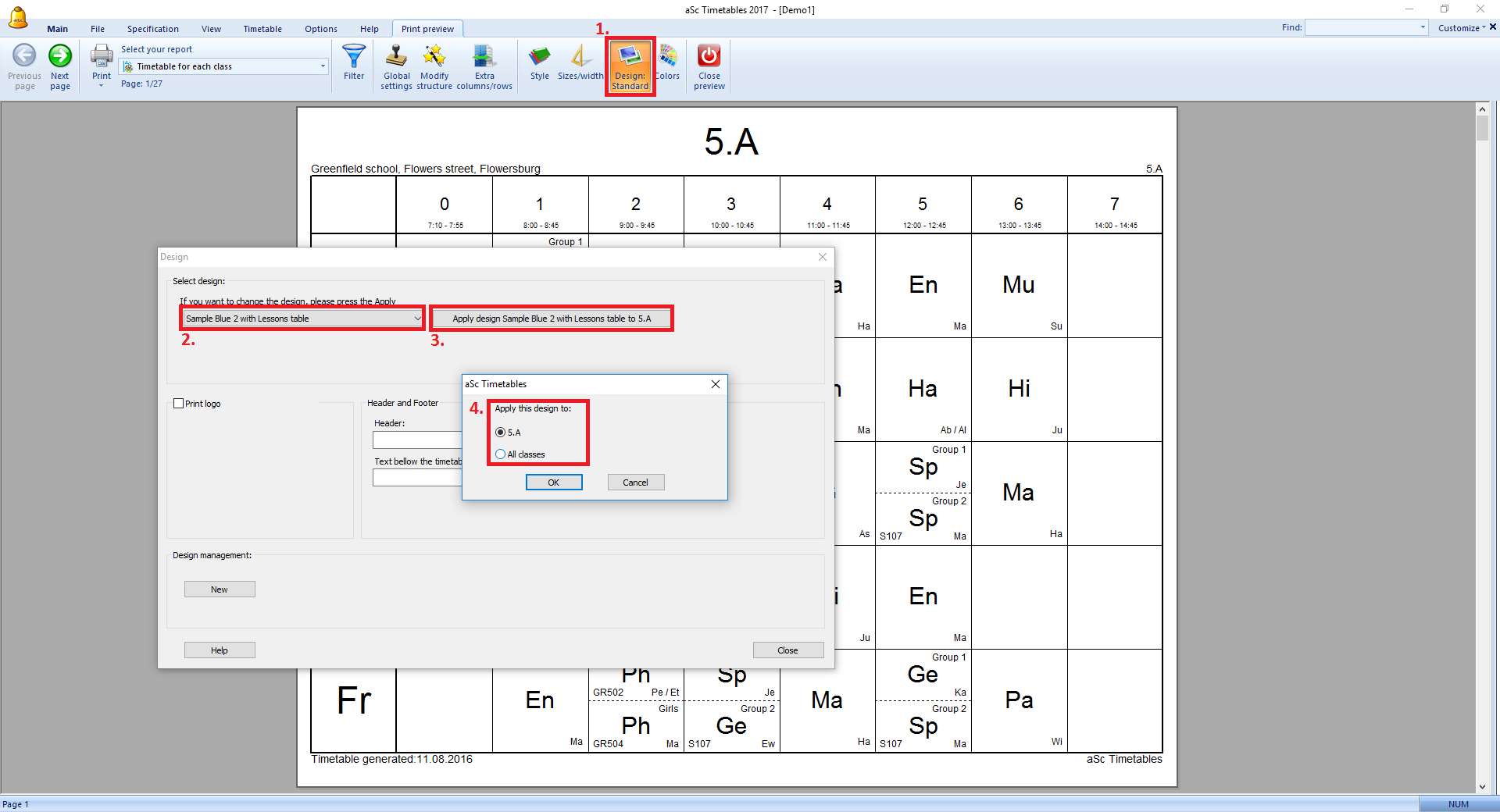 Potom stlačte tlačítko Dizajn. Zvoľte si váš dizajn a stlačte tlačítko Aplikuj. Program sa vás spýta, či chcete aplikovať daný dizajn na vybranú triedu alebo na všetky triedy.