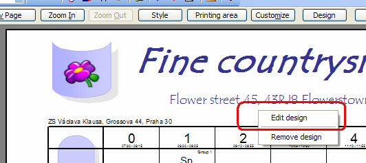 - aktuálne dizajny sa neukladajú do vášho rozvrhového súboru. Takže, ak chcete ten dizajn použiť na inom počítači, najskôr si musíte do druhého počítača ešte pred tlačou skopírovať adresár c:\timetables\designs\náš úžasný dizajn.