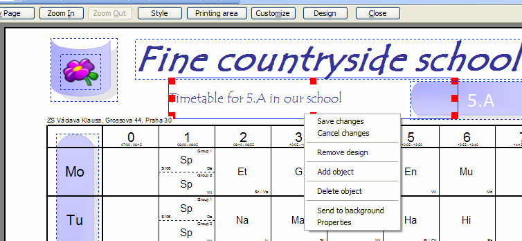 - každý dizajn je zastúpený svojim menom. Tak napríklad, ak zmeníte dizajn nazvaný 'Náš super úžasný dizajn', tak potom všetky triedy/učitelia (aj v iných rozvrhoch), ktorí používajú 'Náš super úžasný dizajn', budú zobrazení so zmenami, ktoré ste vykonali. Tak, ak chcete zmeniť dizajn iba pre jednu triedu, tak vytvorte kópiu 'Super úžasného dizajnu pre 5.A' a zmeňte túto kópiu.