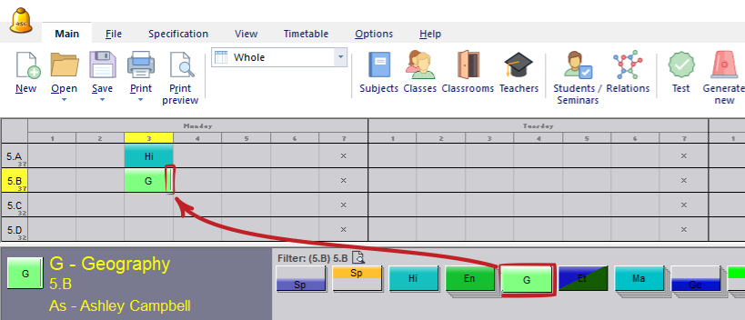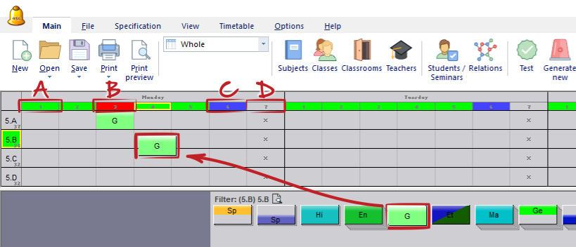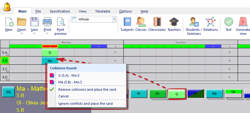 You can change the timetable by simple movements of cards. Of course, the program checks for collisions of classes, teachers and classrooms.