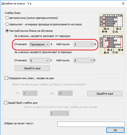 Това автоматично калкулиране на блока от учебни часове е добро за повечето училища. Но, ако класът има 32 часа и искате да позволите да има 5-9 часа дневно, трябва да настроите блока от часове ръчно.