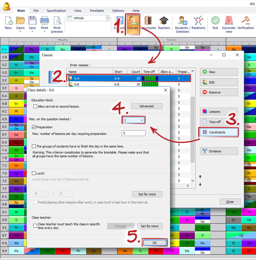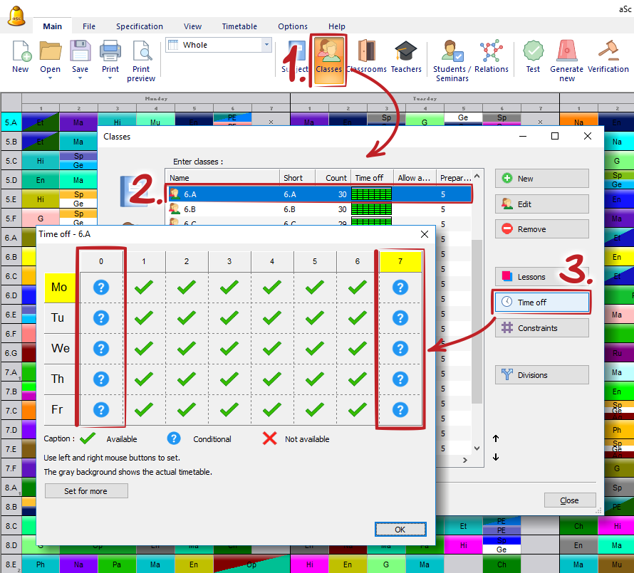 We have specified that all classes can have max 2 lessons on the marked positions per week. So it will not happen that one class will have 3 zero lessons.