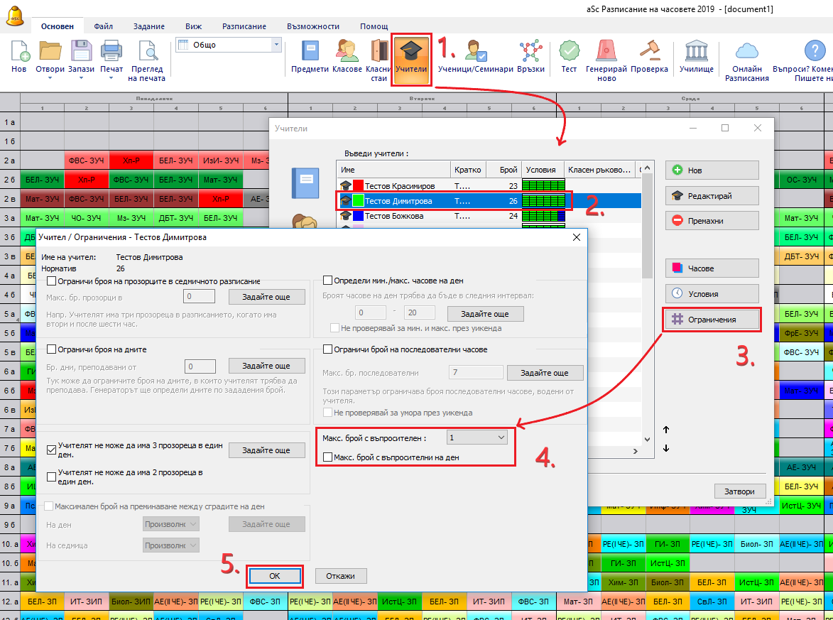 Например, можете да кажете, че 5, 6 и 7 час са под въпрос и учителят може да има максимум 2 часа всеки ден. Тогава можете да сте сигурни, че учителят има най-малко един свободен час за обедна почивка всеки ден.