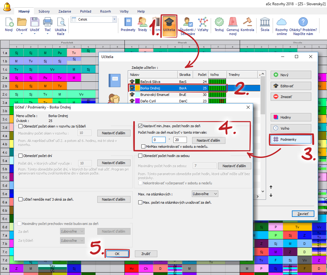 - dajte prosím pozor, aby ste tu nezadali nereálne príkazy. Veľmi doporučujeme takéto aj podobné požiadavky zadať až neskôr. Ak nie je možné vygenerovať rozvrh, bude ešte viac nemožné ho vygenerovať s takou požiadavkou, aby každý učiteľ mal 2-5 hodín za deň. Pozrite: Dobrý spôsob ako vygenerovať rozvrh