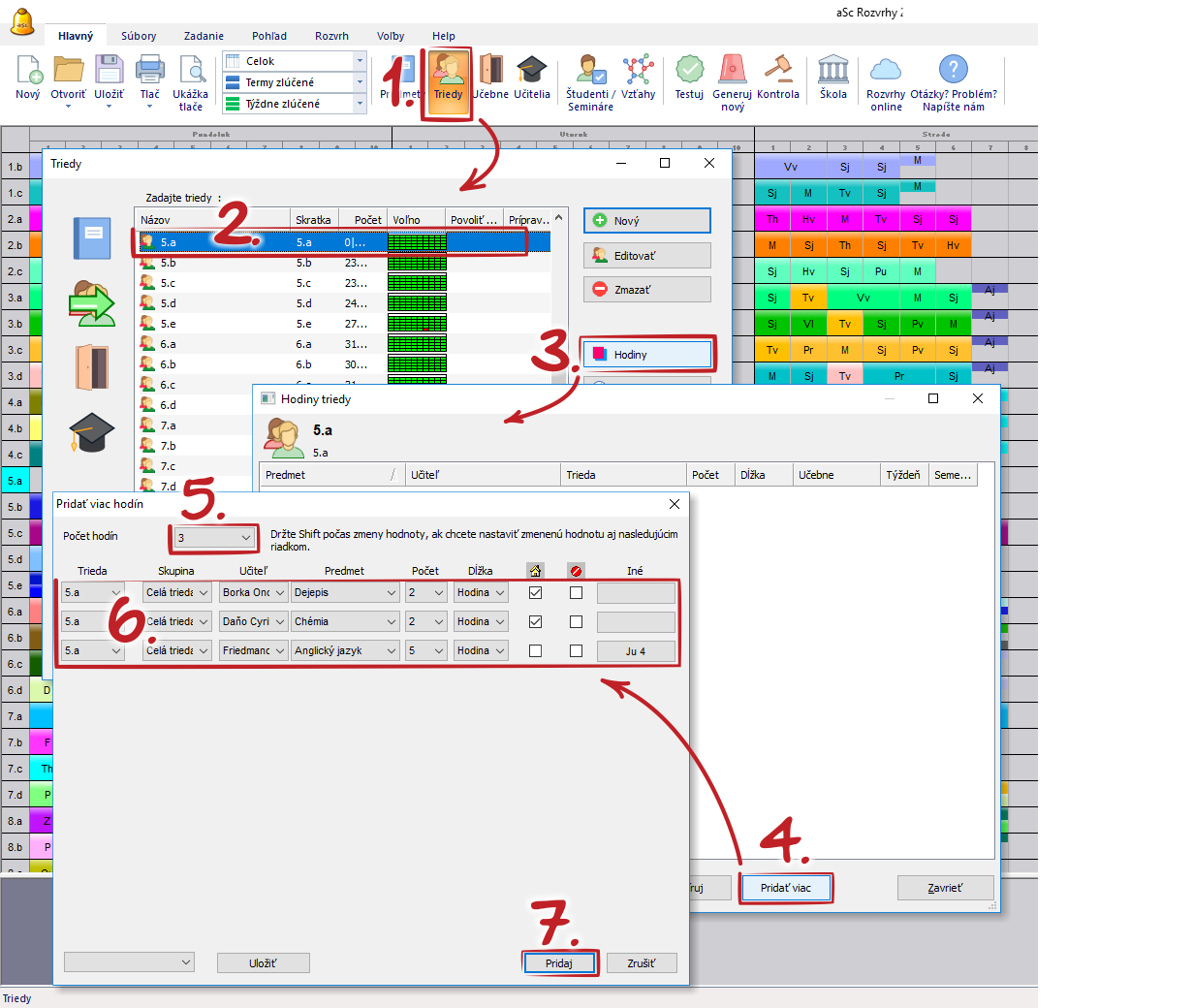 Ak viacerí z Vašich učiteľov / tried majú rovnaké alebo podobné hodiny, môžete použiť tlačidlo 'Pridať viac' a pridať niekoľko hodín naraz:
