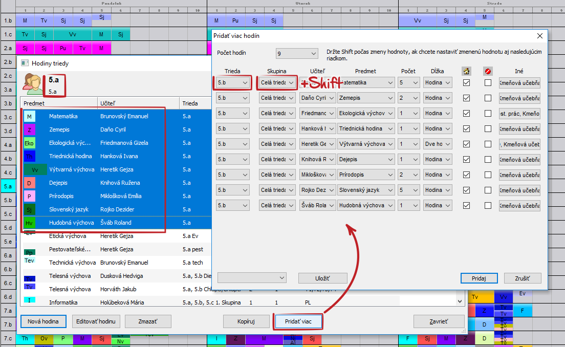 3. Tiež môžete označiť niekoľko hodín v dialógovom okne hodín a následne stlačiť tlačidlo 'Pridať viac'. Vybrané hodíny sú automaticky vyplnené do dialógu. Ak potrebujete zmenu stĺpcov je možné použiť tlačidlo SHIFT a pridať modifikované hodiny rozvrhu: