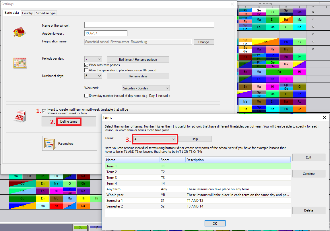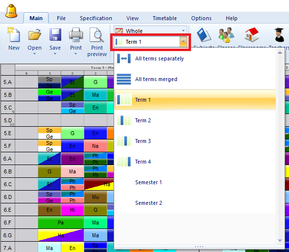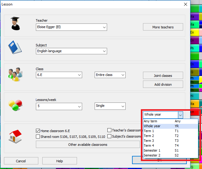 Similar to days also for terms you can define special terms. If you have 4 terms, the software automatically adds two special terms called Semester 1 and Semester 2. Semester 1 is in fact T1 AND T2 so if you for certain lesson/course specify S1 then it will be on both T1 and T2 at the same day/period.
