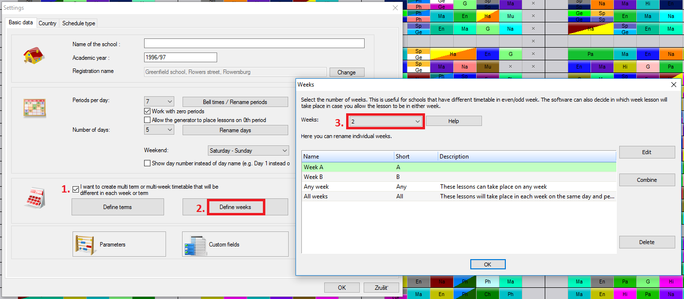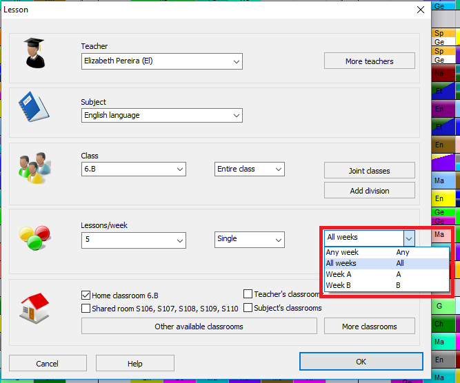 Then for each lesson, you can say in which week it can be. Default is All weeks. This means it will be at the same position in all weeks. If you change this to lets say Any week, the software will allow you to place this lesson into week 1 OR 2.