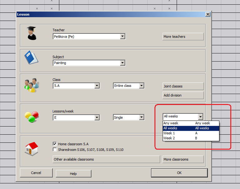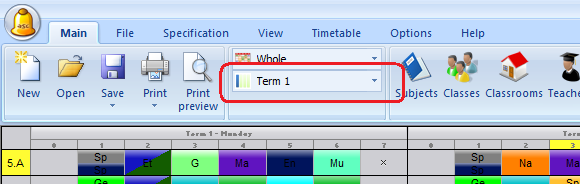 Pre každú hodinu môžete definovať, v ktorom semestry alebo štvrťroku (terme) má byť umiestnená. Môžete priradiť presný štvrťrok prípadne zadať, že hodina má byť v ľubovolnom alebo v každom štvrťroku. Okrem toho môžete povedať, že hodiny maju byť v "T1 A T2" alebo "T1 ALEBO T2" alebo napríklad iba T4.