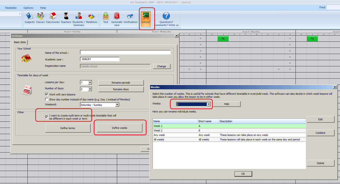 Termy zadefinujete cez menu Hlavný - Škola. Označte, že Vaša škola používa viactýždňový alebo viac semestrový rozvrh a zadajte príslušný počet termov: