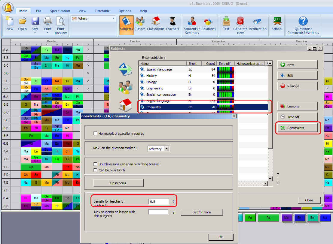 It is now possible to specify the length of each subject. So for example if you have English conversation lessons that do only add 0,5 to the total teachers contract, you can specify this in Subjects/Constraints dialog. This number only affects the teacher’s contract.