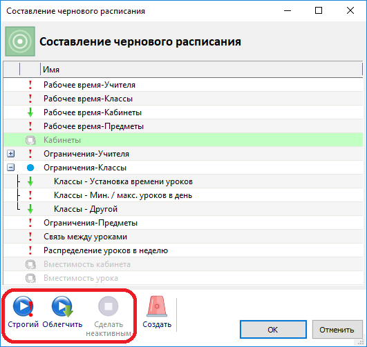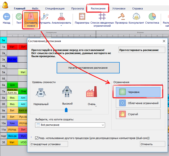 На ранних стадиях создания расписания рекомендуется создать черновик расписания - это расписание без каких-либо ограничений.