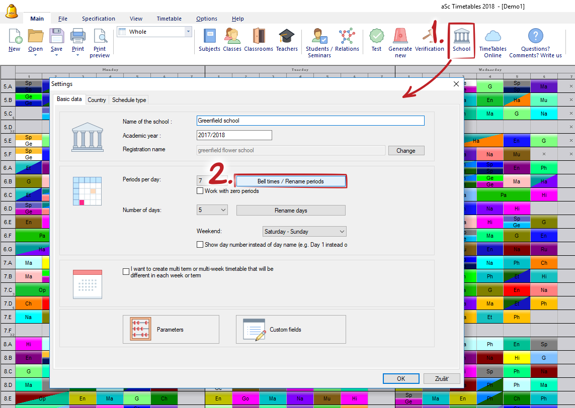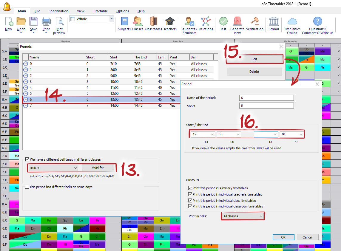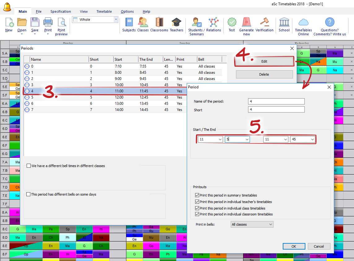 1. Change time of periods for first group of classes. This will be "Bell 1" and time of each period you can simply modify after you click on „Edit“ and set timing as required.