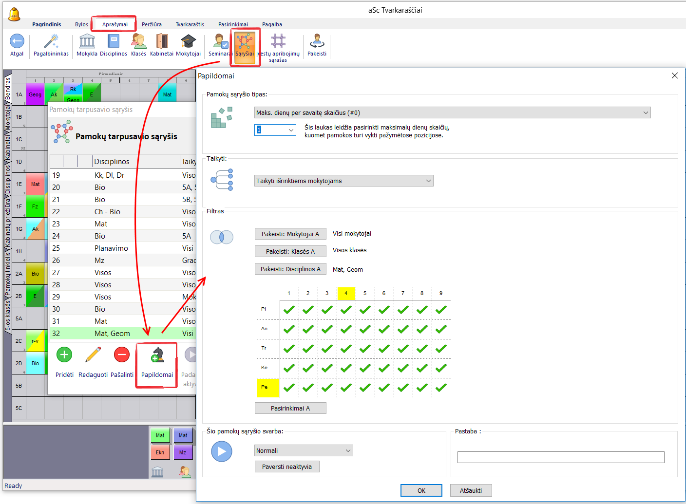 Nustatant papildomus pamokų sąryšius, galima pasirinkti, kam jie yra taikomi.