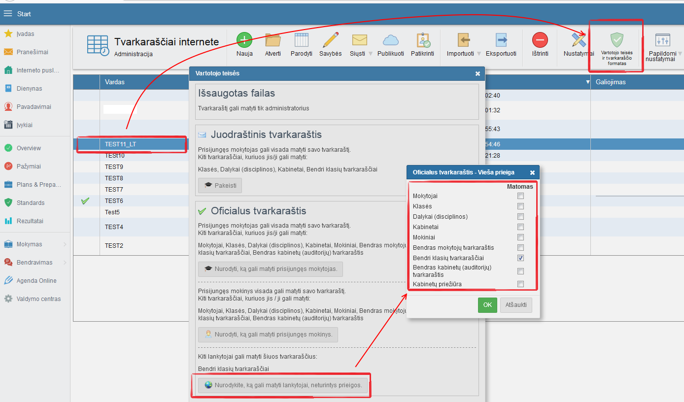Pagal pradinius nustatymus visi lankytojai gali matyti tik individualius klasių tvarkaraščius.