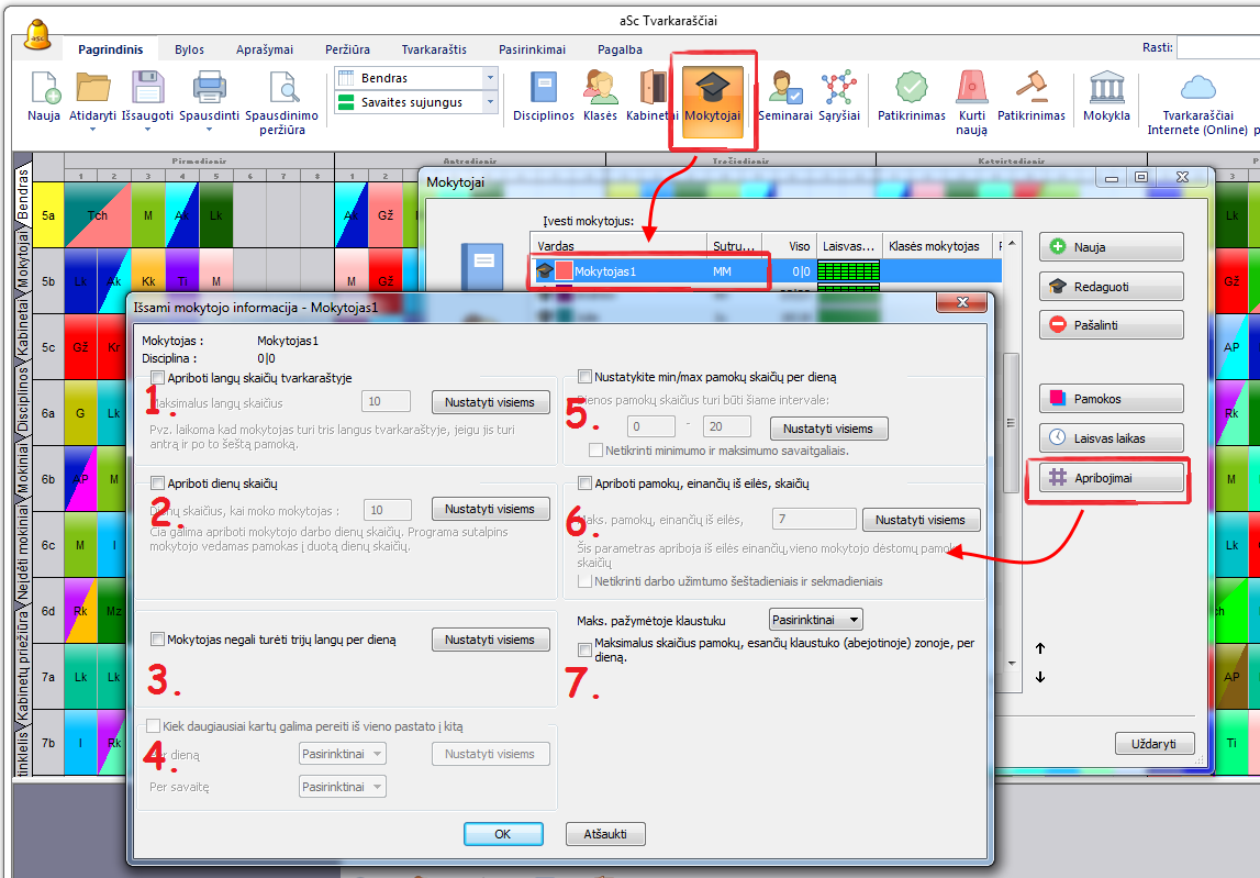 6. Apriboti pamokų, einančių iš eilės, skaičių. Skaičius nurodo, kiek pamokų šis mokytojas gali vesti iš eilės be pertraukos (lango). Žiūrėkite: Kaip įvesti apribojimą, kad mokytojai neturėtų daugiau kaip 6 nuosekliai einančių pamokų?