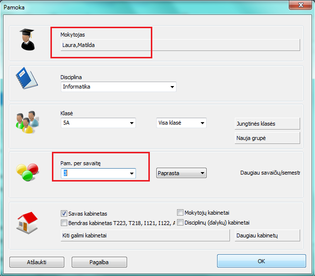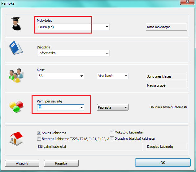 - Jeigu šių pamokų disciplina ta pati, tada programa automatiškai bandys įdėti šias 5 pamokas taip, kad jos pasiskirstytų tolygiai per savaitę, šiuo atveju po vienas periodą (laikotarpį) per dieną.