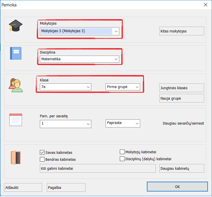 Tuomet programai sudarant tvarkaraštį, abi pamokos gali būti įdėtos vienu laiku: