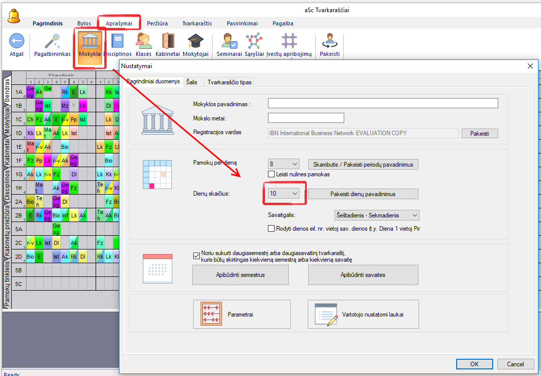 Jei tvarkaraštis sudaromas daugiau nei 7 dienoms (savaitei), įrašykite reikiamą dienų skaičių į "Tvarkaraštis daugiau nei septynioms dienoms" langelį. Šį langą atversite su "Pagrindinis, Mokykla". Pavyzdžiui, 10 dienų.