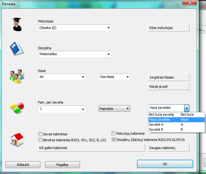 Tuomet pamokos informacijos lange galima pasirinkti, kad kai kurios pamokos vyksta cikliškai: pavyzdžiui, vieną savaitę vyksta, o kitą ne, arba vyksta tik kas trečią savaitę (jei nurodėte, kad gali būti 3 skirtingos savaitės) ir pan.