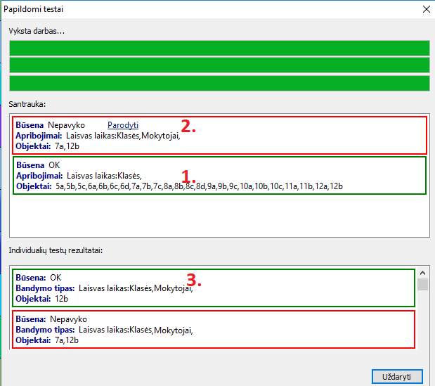 Pavyzdžiui paveikslėlyje žemiau programa pirma pabandė sukurti tvarkaraštį be jokių apribojimų, išskyrus laiko apribojimus klasėms. Šis testas buvo sėkmingas (Nr.1).