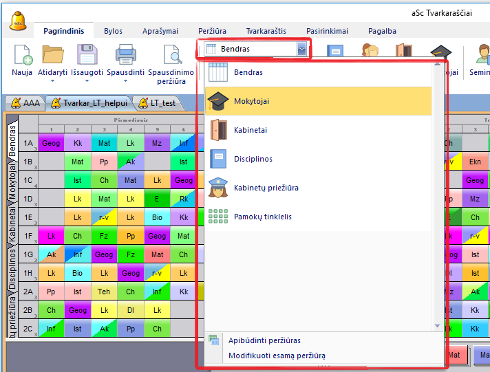 Galima greitai patikrinti tvarkaraščio teisingumą keletui mokytojų, klasių ar kabinetų taip: pirmiausia pasirinkite norimą peržiūrą (Bendrą/Mokytojus/Kabinetus/Disciplinas/Mokinius).