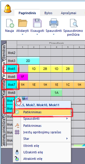 Pastaba: galima patikrinti discipliną, klasę, kabinetą ar mokytoją paspaudus bet kurią pamokos kortelę dešiniu pelės mygtuku ir pasirinkus "Patikrinimas".