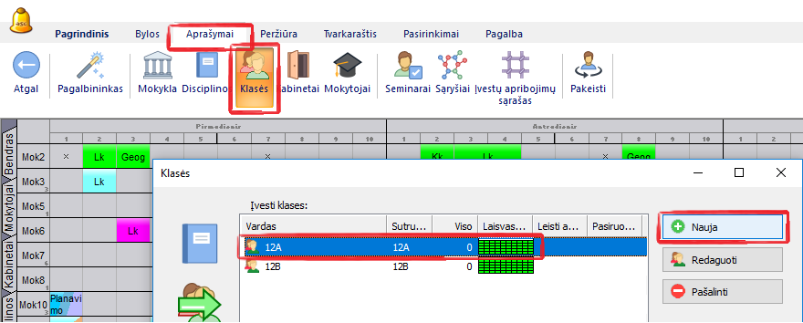 Prieš įrašant mokinius (studentus), reikia į programą įrašyti klases: