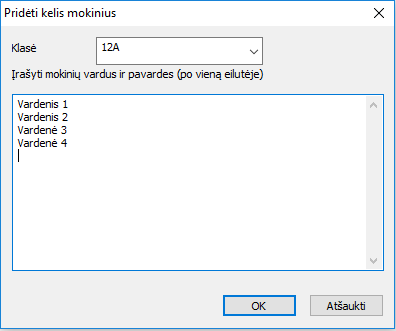 Tačiau pasirinkimus galima įvesti ir vėliau, keliems mokiniams iš karto, todėl pradžioje galima įrašyti tik mokinių vardus ir jų klases, pasirinkus "Pridėti kelis mokinius":