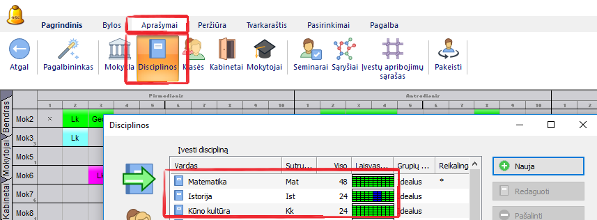 Pamatysite, kad tas disciplinos langelis (ir pati disciplina sąraše) taps raudoni - tai yra todėl, kad nors mokinys yra paskirtas į seminarą, tačiau dar nėra sukurtų jo pamokų.