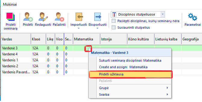 Galima įrašyti pasirinkimus dviem būdais - vienu atveju tiesiog dukart paspaudus pele mokinio vardą, o kitu - pasirinkus "Disciplinos stulpeliuose", ir dešiniu pelės mygtuku paspaudus reikiamo moksleivio langelį, galima nurodyti jo pasirinkimą, pavyzdžiui, į matematikos seminarą: