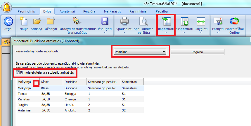 3. Pasirinkite "Pamokos" ir "Pirmoje eilutėje yra stulpelių antraštės". Jei programa neatpažins stulpelių pavadinimų, paspauskite juos pele ir pasirinkite reikiamą: