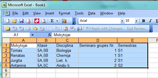 Mokinių sąrašo importavimas į seminarų langą iš MS Excel programos (antras būdas)