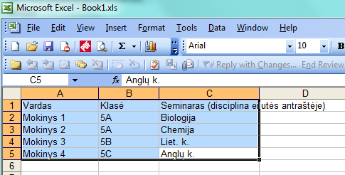 Mokinių sąrašo importavimas į seminarų langą iš MS Excel programos (antras būdas)