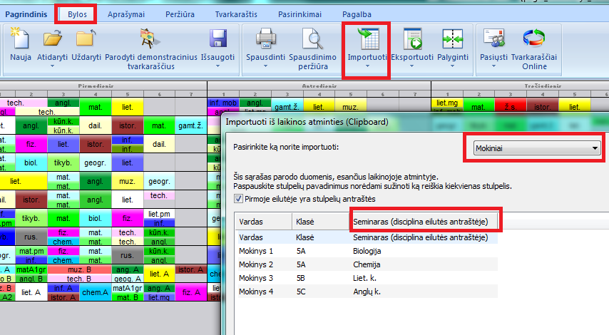 Jei atitinkamas objektas (klasė, mokinys ar seminaras) bus nerastas, importavimo metu jis bus sukurtas.