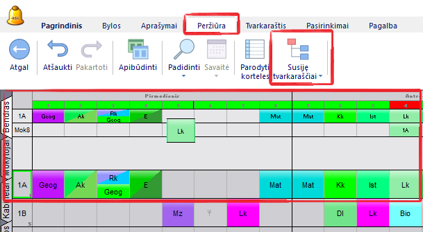 Pastaba: Laikant nuspaustą SHIFT mygtuką, galima matyti susijusias tvarkaraščio eilutes tai pamokai, kuri yra po kursoriumi (arba paimta).