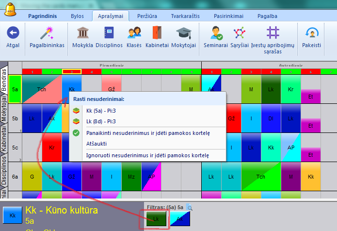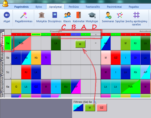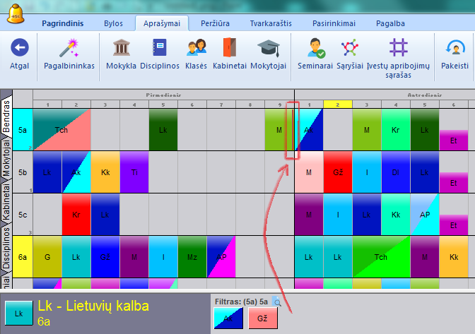 Klasės, kuriai priklauso ta pamoka, eilutės pavadinimas nusidažys žaliai. Programa neleis padėti pamokos į ne šios klasės eilutę.