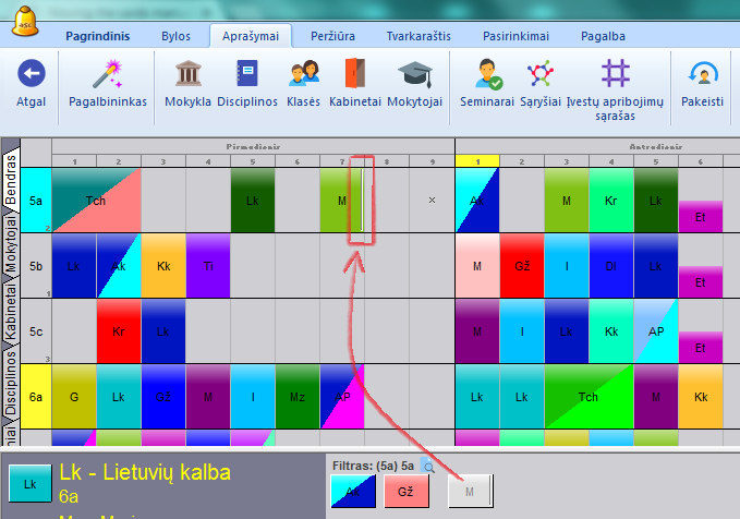 Padėjus pamoką, programa jai automatiškai priskirs kabinetą iš galimų kabinetų sąrašo. Jeigu šiai pamokai neatsiras kabineto, programa leis pamoką padėti į šią vietą, bet jos kortelė bus pažymėta baltu brūkšneliu dešiniame krašte.
