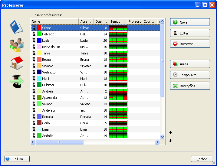 Aqui você pode usar os botões Nova..., Editar..., e Remover para adicionar, editar e excluir professores. Você pode usar o botão Tempo livre... para informar os dias e aulas que o professor selecionado não pode lecionar.