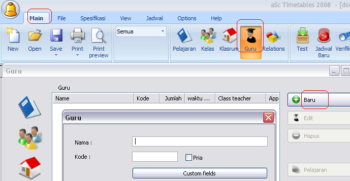 Here you can use buttons New..., Edit..., and Remove to add, edit and remove teachers. You can use the button Time off... to enter slots in which the selected teacher cannot teach.