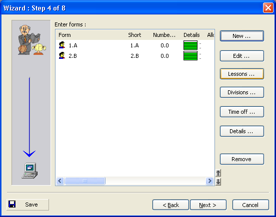 - The order in which the classes are shown in this list is the same as in which the classes are shown on the main screen and in which they are printed. See: How can I sort teachers/classes/subjects/classrooms?