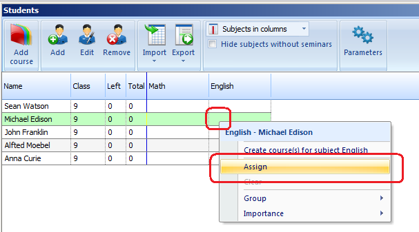 פשוט קליק ימני על תא הבחירות של התלמיד. לדוגמה זה יוסיף אנגלית לתוך השעורים של אדיסון: