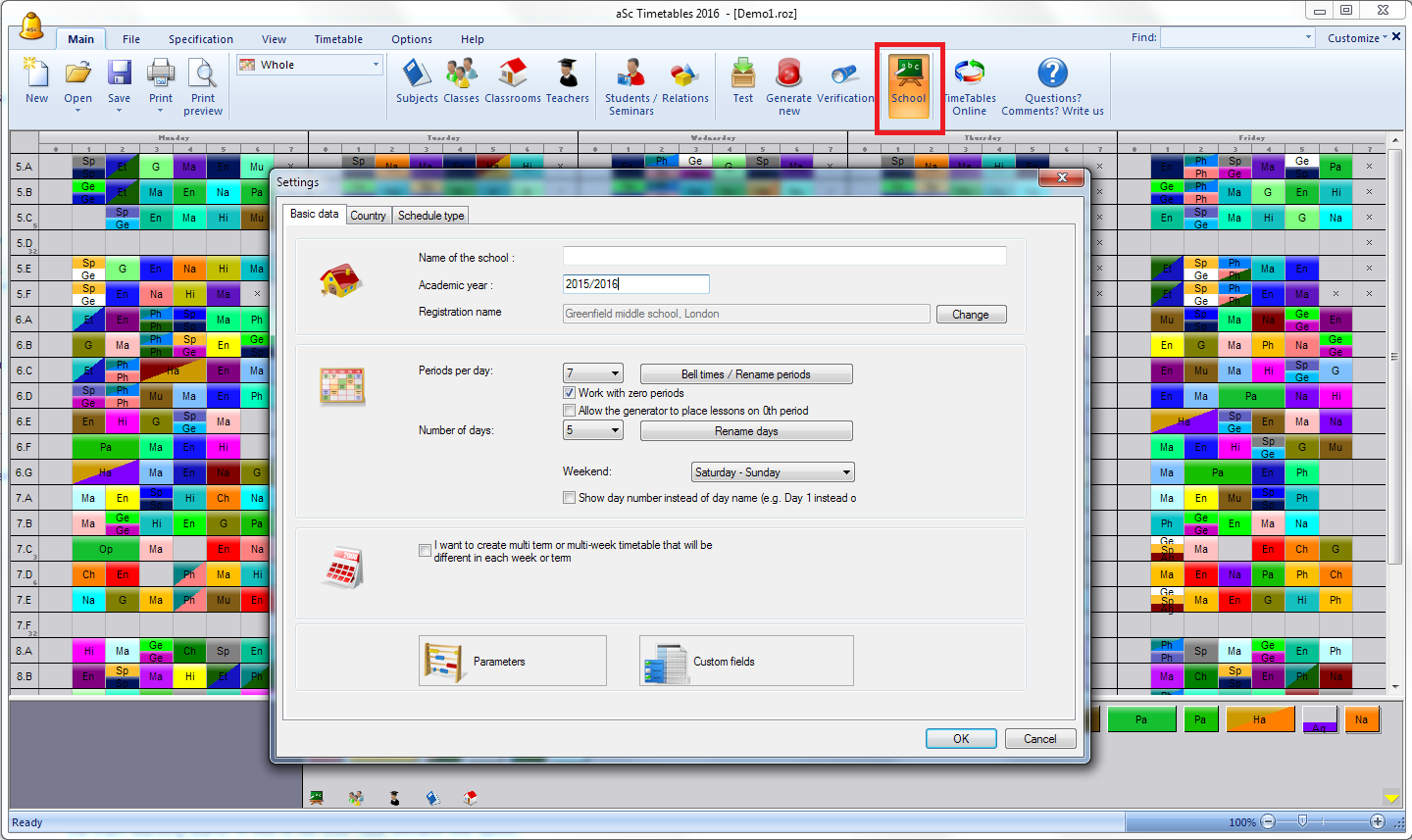 Použitím menu Voľby/Škola alebo krok 2 v Sprievodcovi môžete zadať nasledovné údaje: