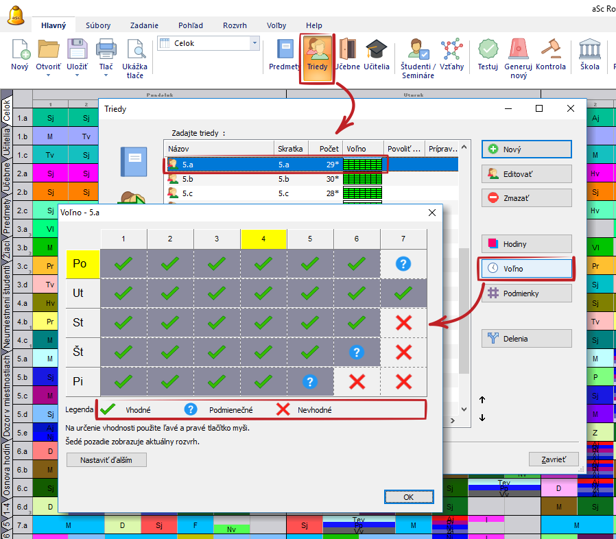 Kliknutím na Voľno... môžete zadať, či určitá trieda môže alebo nemôže mať hodiny. Napríklad, ak trieda 8.A navštevuje každú stredu ráno sv.omšu alebo žiaci musia každý piatok poobede držať čestnú stráž pred sochou vášho slávneho spisovateľa, tak môžete v rozvrhu zablokovať tieto hodiny na daný čas.