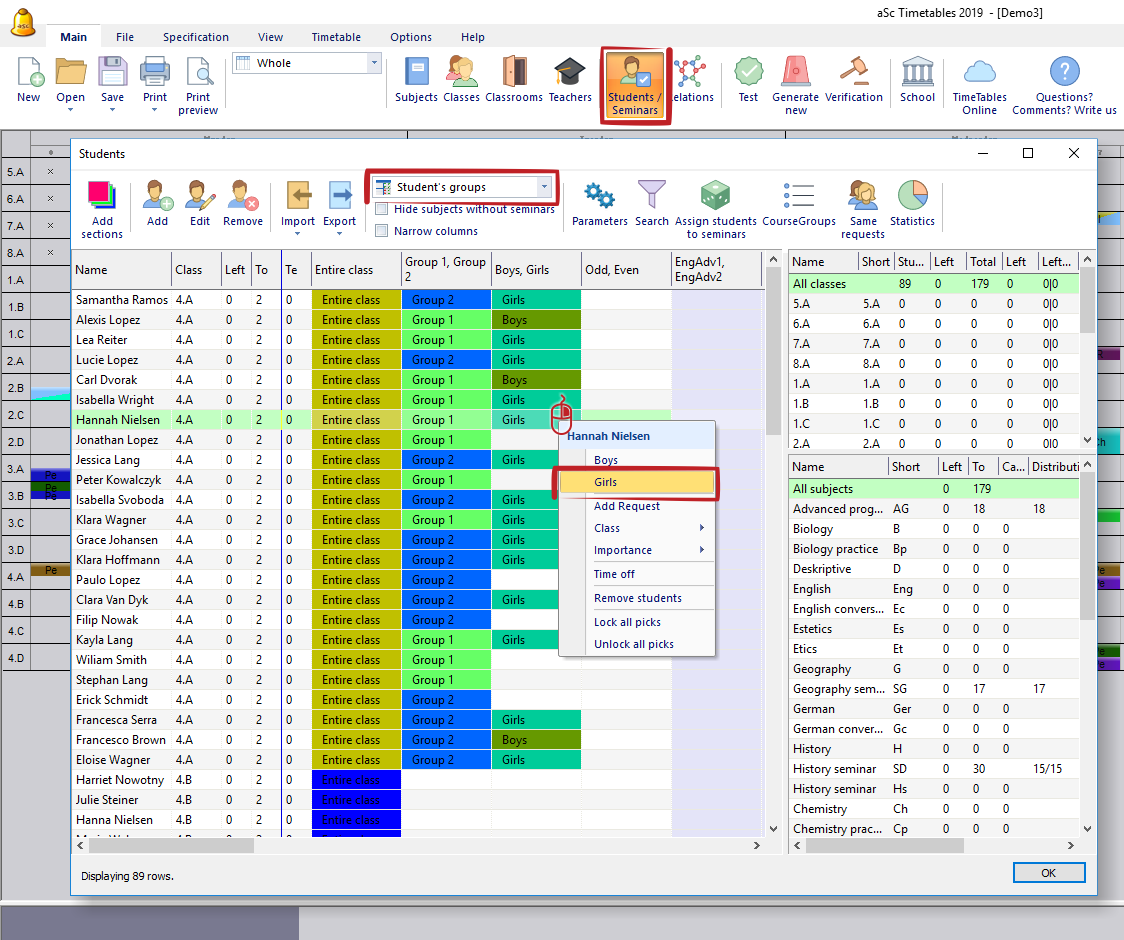 - You can not combine groups from different divisions on the same place in the timetable, even if these groups have different students selected in this window. If you need this, you will have to use Seminars instead of Groups/Divisions.