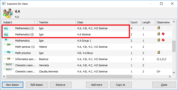 Špeciálna situácia nastáva, ak v jednej triede zadáte dve seminárové hodiny s tým istým predmetom. Program takúto situáciu chápe, že ide o dve hodiny, na ktorých sa vyučuje to isté vyučovanie. Teda, ak sa žiak prihlásil na tento predmet, tak je jedno ktorú z týchto dvoch hodín bude navštevovať (ale môže navšťevovať iba jednu). Toto sa používa hlavne ak sa nejaký seminár prihlásilo veľa žiakov, takže ich bude treba rozdeliť do dvoch skupín.