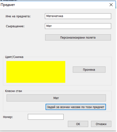 1. Всеки път, когато добавяте нов час, в зависимост от въведените учебни предмети, програмата автоматично ще избира класните стаи и така ще спести усилието вие да ги нанасяте. Разбира се, можете винаги да промените дадена класна стая, ако определен учебен предмет изисква това.