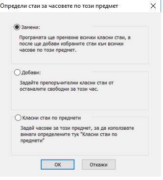 Като направите това, можете да Заместите/ Добавите класните стаи за часовете, които вече сте определили.